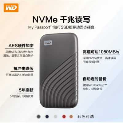 西部数据(WD)1TB NVMe 移动固态硬盘(PSSD)My Passport随行SSD版 深空灰 Type-C接口 防摔 加密 存储