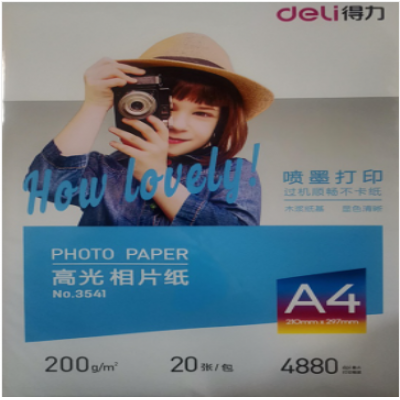 得力(deli)3541 高光面照片纸相片纸 彩色喷墨打印纸 A4 200g 20张/包