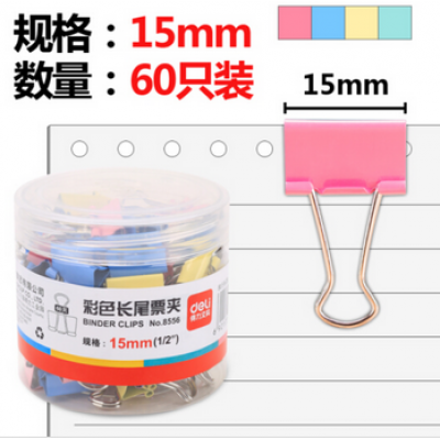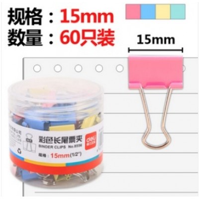 得力(deli)15mm彩色长尾夹票夹 6#金属燕尾夹票据夹子 60只/筒 8556