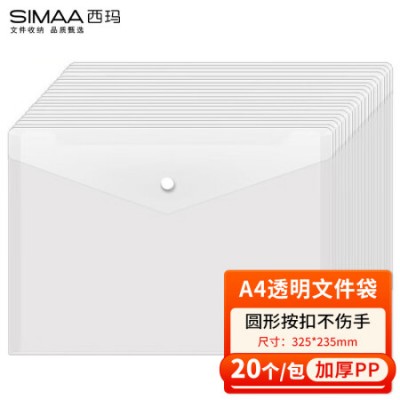西玛(SIMAA)20个装 a4透明按扣文件袋 加厚 试卷收纳 防水资料档案袋 学生文件 办公用品 6126