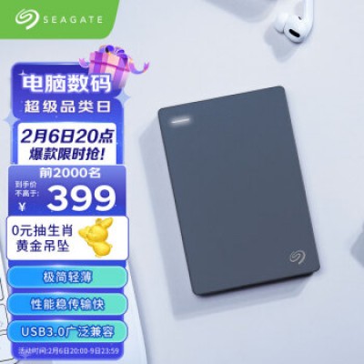 希捷(Seagate) 移动硬盘 2TB USB3.0 简 2.5英寸 机械硬盘 高速 轻薄 便携 兼容PS4