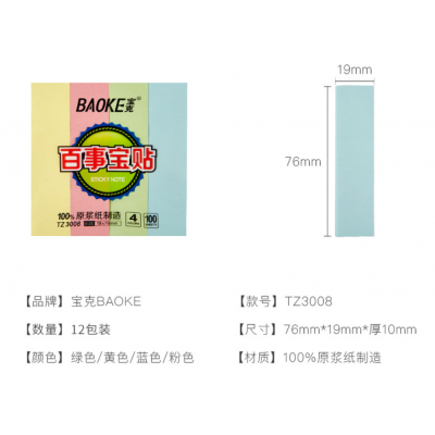 宝克(BAOKE) TZ2003百事贴 便利贴 彩色留言纸 便签标签纸 作业贴可重复自粘便条纸 学习办公用品文具 51×76mm 单包/4色