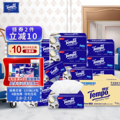 得宝(TEMPO)抽纸无香4层加厚100抽*18包湿水不易破 纸巾 餐巾纸 卫生纸整箱