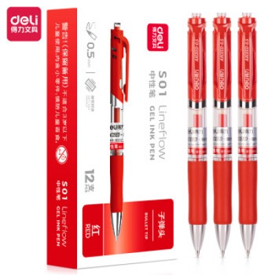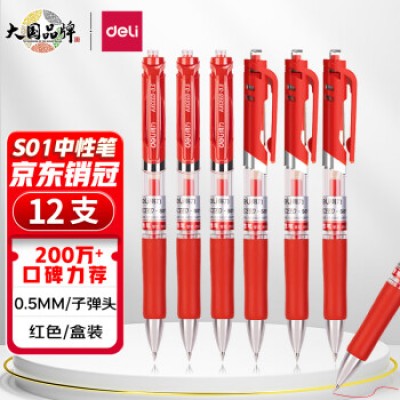 得力(deli)S01中性笔签字笔 0.5mm子弹头经典办公按动笔水笔 红色 12支/盒